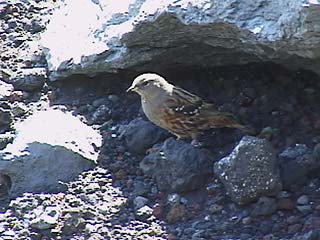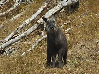 富士宮口5合目の西側の沢沿いは雪崩跡が草原になっています。森を出てたところで、草原の上方からカモシカが駆け降りてきました。そこで、目の前にいた私たちに気がついて固まっているところです。しばらくにらめっこしたあとで、こんどは反対側の沢に駆け降りていきました。宝永第一火口では落石が頻発していました。